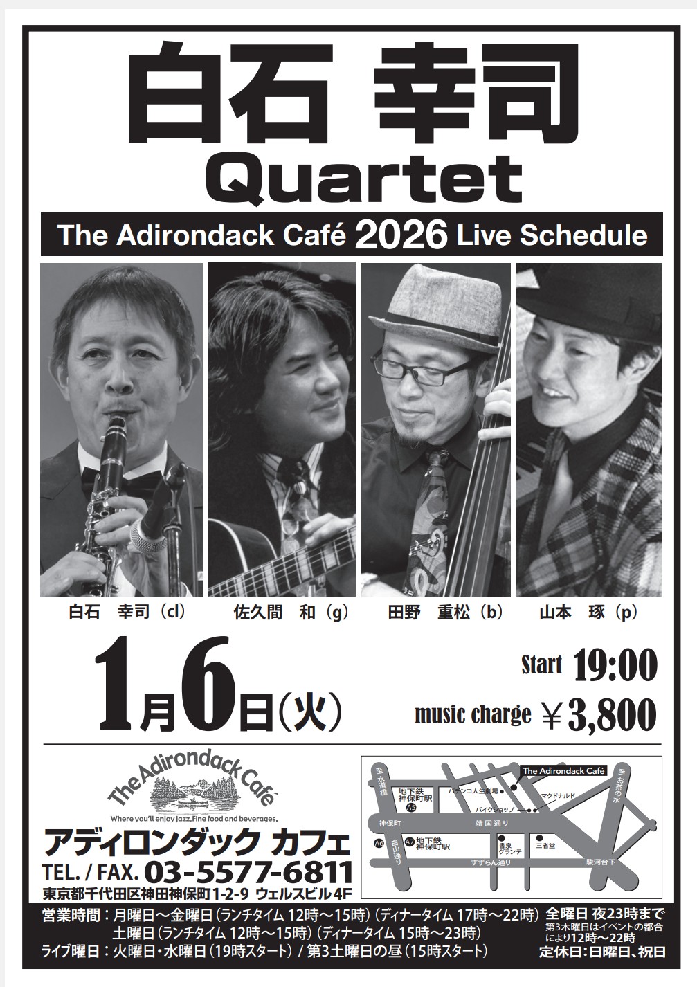 | 20日 | 白石幸司グループ 浅草サムディ ¥3300(+1drink650~&1food600~+Tax) 白石幸司(cl) 佐久間和(g) 板垣光弘(p) 小林真人(b) |