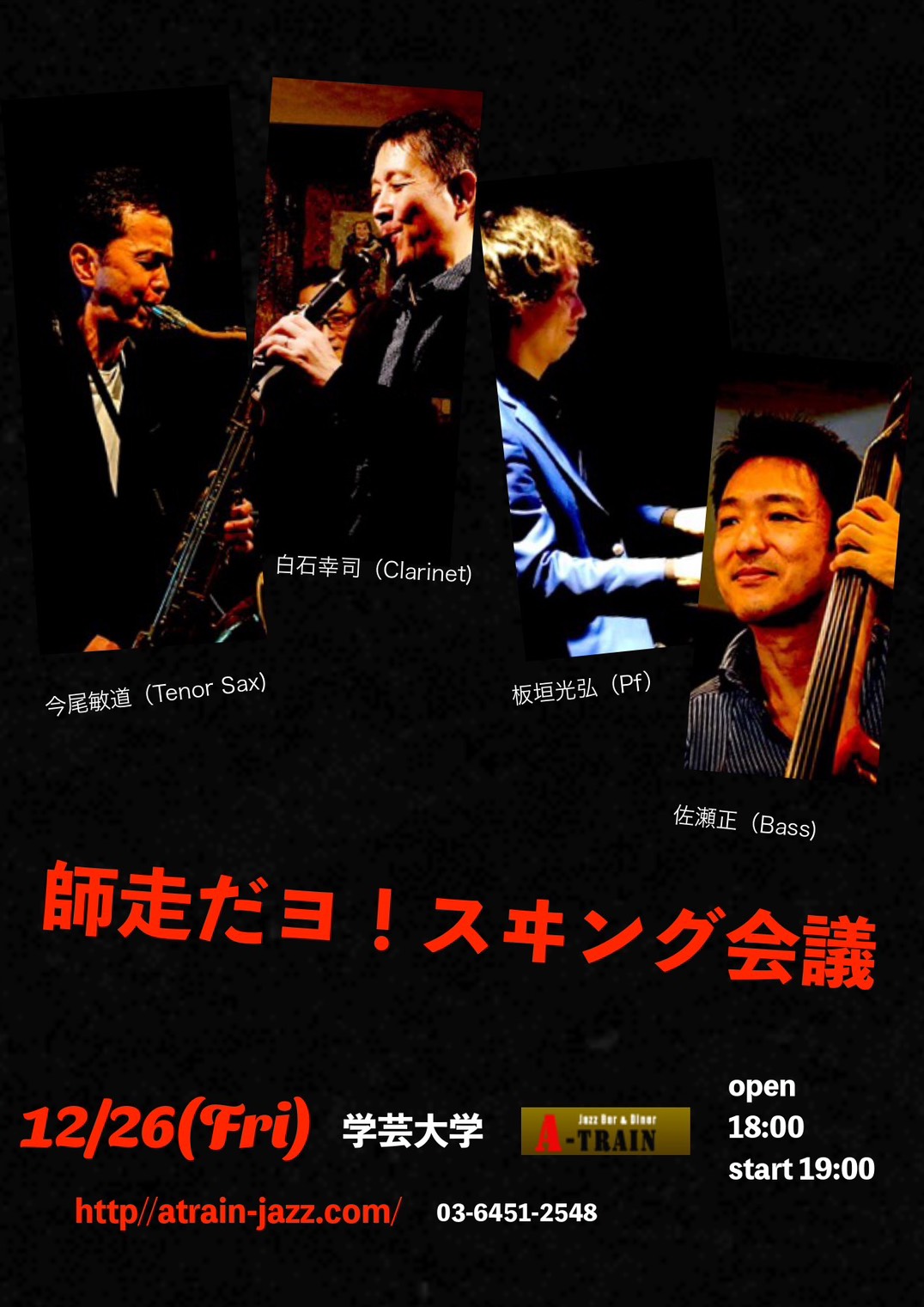 | 26日 | 駅前スウィング会議 学芸大学A-TRAIN 19:00-21:30 今尾敏道(TS) 白石幸司(CL) 板垣光弘(Pf) 佐瀬正(B) ![]() |